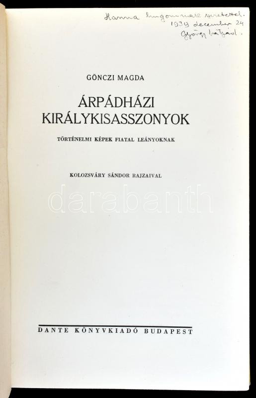 Description: Gönczi Magda: Árpádházi királykisasszonyok. Történelmi képek fiatal leányoknak. Kolozsváry Sándor rajzaival. Bp.,1938, Dante, 157+3 p. Szövegközti és egészoldalas rajzokkal illusztrált. Kiadói illusztrált aranyozott gerincű félvászon-kötés, a borítón kis kopásnyomokkal.