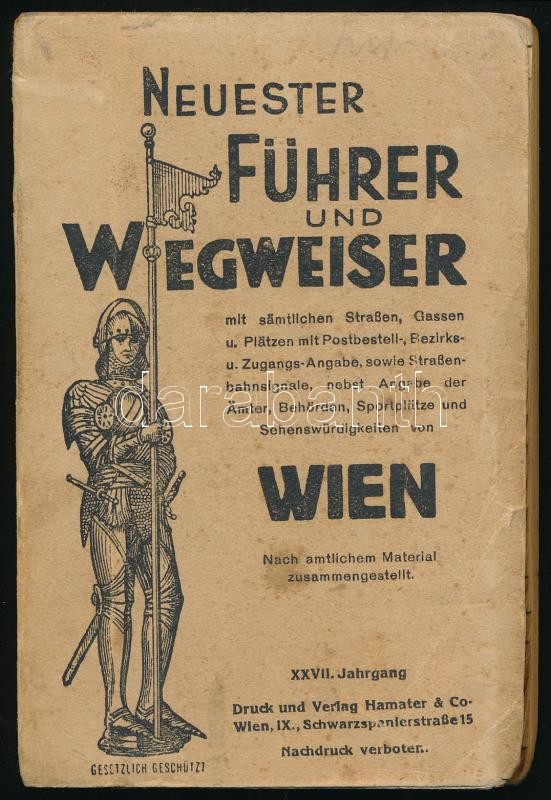 Neuester Führer und Wegweiser mit sämtlichen Straßen, Gassen und Plätzen mit Postzustell-, Bezirks- und Zugangs-Angaben, sowie Straßenbahnsignale, nebst Angabe der Ämter, Behörden und Sehenswürdigkeiten von WIEN. XXVIII. Jahrgang. Wien, (1938), Hamater & Co. Német nyelven. Kiadói papírkötés, kopott borítóval.