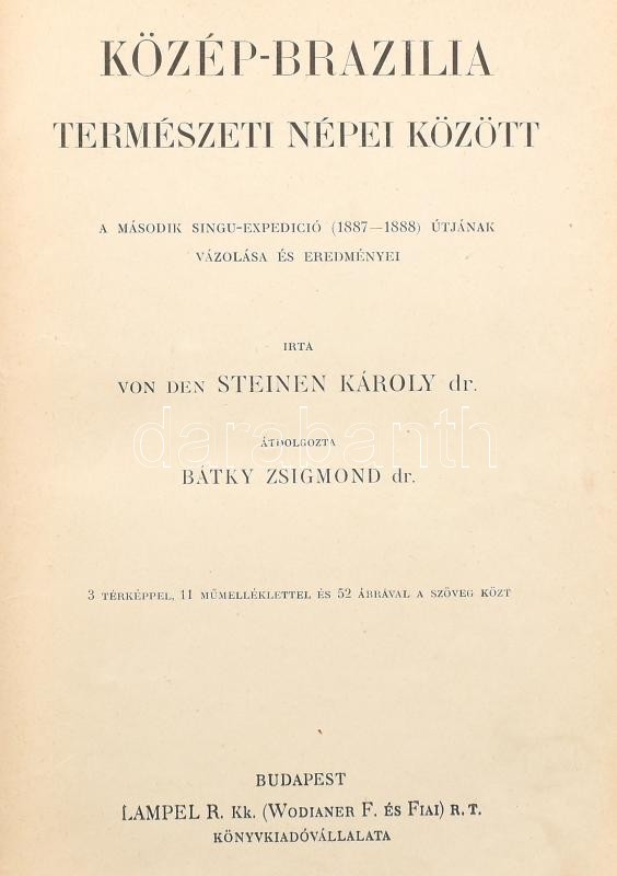 [Steinen, Karl von den (1855-1929)]: dr. Steinen Károly: Közép-Brazília természeti népei között. A második Xingú-expedició (1887-1888) útjának vázolása és eredményei. 3 térképpel. Ford.: dr. Bátky Zsigmond. Bp., é.n., Lampel R. (Wodianer F. és Fiai), Franklin, 275 p. +11 (fekete-fehér fotók) +3 (térkép) t. Egészoldalas és szövegközi illusztrációkkal, fekete-fehér fotókkal, térképekkel illusztrálva. Kiadói aranyozott, festett, illusztrált félvászon-kötés, a borítón kis kopásnyomokkal.