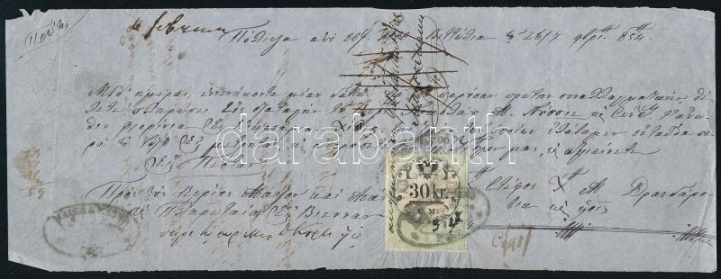 Description: 1854 30 kr okmánybélyeg a Macso & Manno (Macsó György - Mannó István) pesti székhelyű szállítmányozási cég német nyelvű dokumentumán, a cég bélyegzőjével