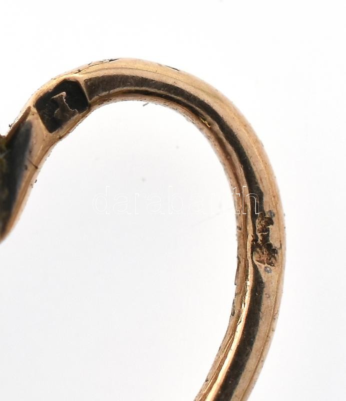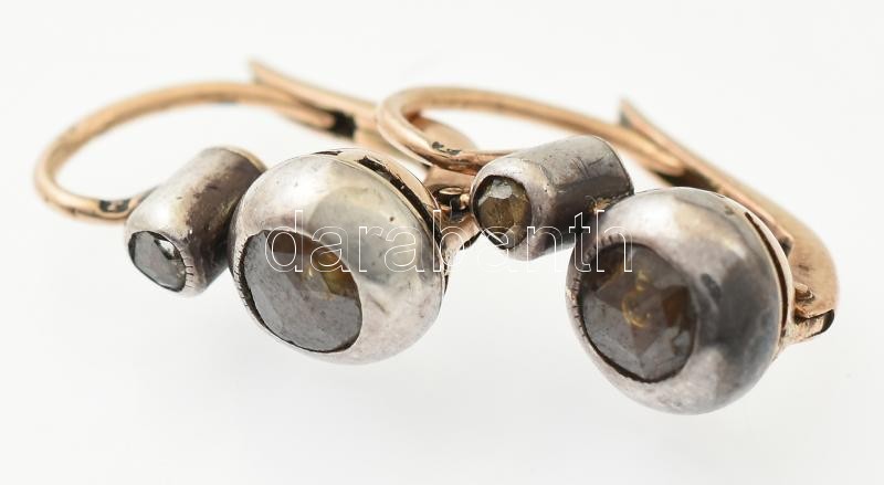Arany (Au) 14k és ezüst (Ag) fülbevalópár, buton foglalt 2 régi csiszolású achtkant cca. 0,40 ct, és 2 apró, achtkant csiszolású gyémánt cca. 0,04 ct, patentzárral, 1930 körül, jelzett, bruttó: 3,2 g