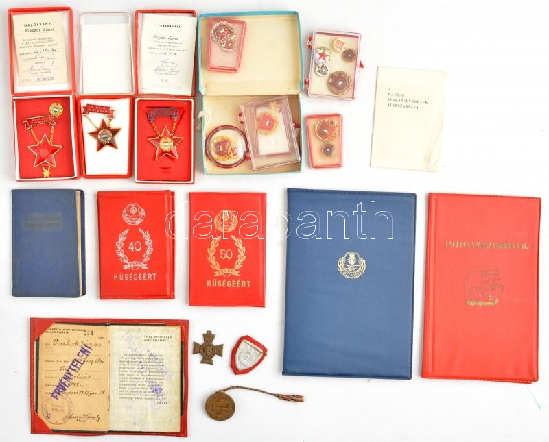 13db vegyes, főleg szocialista (Kiváló Dolgozó, Szocialista Brigád) kitüntetés, nagyrészt miniatűrrel, tokokkal, viselési igazolványokkal, szakszervezeti tagsági könyvekkel közte 1898. "Jubileumi Emlékérem Fegyveres Erő Számára / Signum memoriae (AVSTR)" Br kitüntetés mellszalag nélkül, közte egy II. osztályú Tiszti Szolgálati Jel Br kitüntetés hamisítványa T:2-3