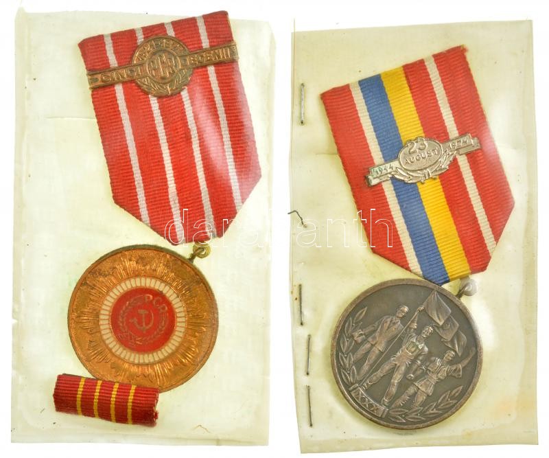 Románia 1971. "A Román Kommunista Párt 50. évfordulója 1921-1971" aranyozott, zománcozott fém kitüntetés mellszalagon, szalagsávval + 1974. "A felszabadulás 30 éves évfordulója" kitüntetés mellszalagon T:1-,2 Romania 1971. "50th Anniversary of the Romanian Communist Party" gold plated enamelled decoration with ribbon and service ribbon + 1974. "For the 30th Anniversary of the Liberation" decoration on ribbon C:AU,XF