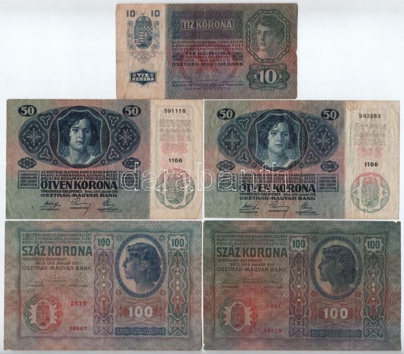 https://www.darabanth.com/en/412-Online-auction/412.0/Numismatics/Hungarian-Banknotes~1500008/1912-100K-2x-plus-1914-50K-2x-plus-1915-10K-TIII-III-kozte-szep-papir-az-egyiken-kisebb-folt-~II2564299