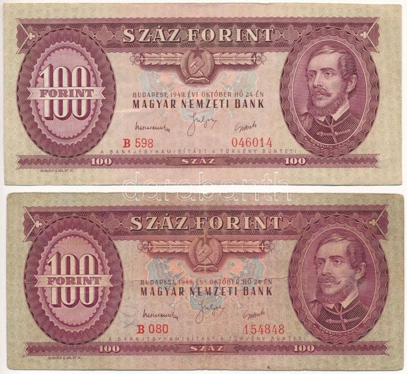 https://www.darabanth.com/en/412-Online-auction/412.0/Numismatics/Hungarian-Banknotes~1500008/1949-100Ft-2x-B-080-154848-es-B598-046014-TIII-III-az-egyiken-kozepen-kis-szakadas-folt-~II2569727