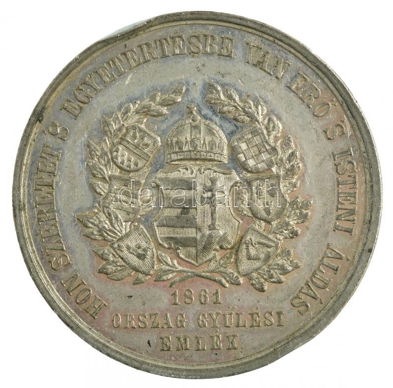 1861. "Országgyűlési Emlék" kétoldalas Sn emlékérem. "HON SZERETET 'S EGYETÉRTÉSBE VAN ERŐ 'S ISTENI ÁLDÁS - 1861 ORSZÁG GYŰLÉSI EMLÉK / E HAZA CSAK AKKOR TULAJDONUNK HA TÖRVÉNYEINKET NEM IDEGENEK KEZELIK - HAZÁDNAK RENDÜLETLENÜL LÉGY HÍVE....". (35,47g/50mm) T:1-,2 ph.