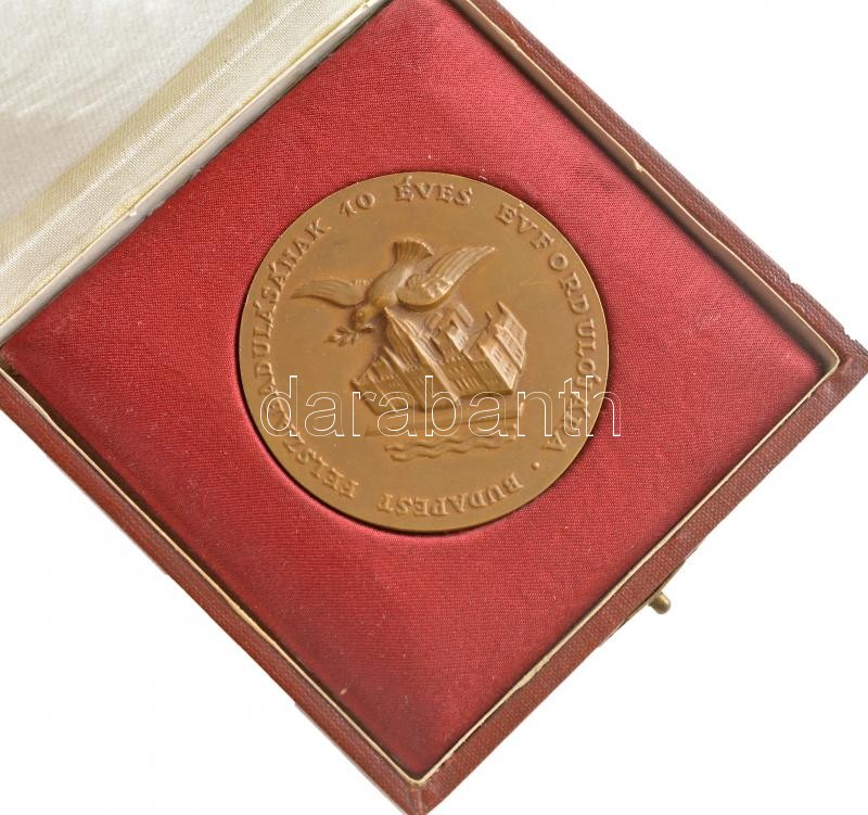 Description: Boldogfai Farkas Sándor (1907-1970) 1955. "BUDAPEST FELSZABADULÁSÁNAK 10 ÉVES ÉVFORDULÓJÁRA / BUDAPEST FŐVÁROS TANÁCSA 1955. FEBR." kétoldalas bronz emlékérem, eredeti sérült dísztokban (60mm) T:1-,2