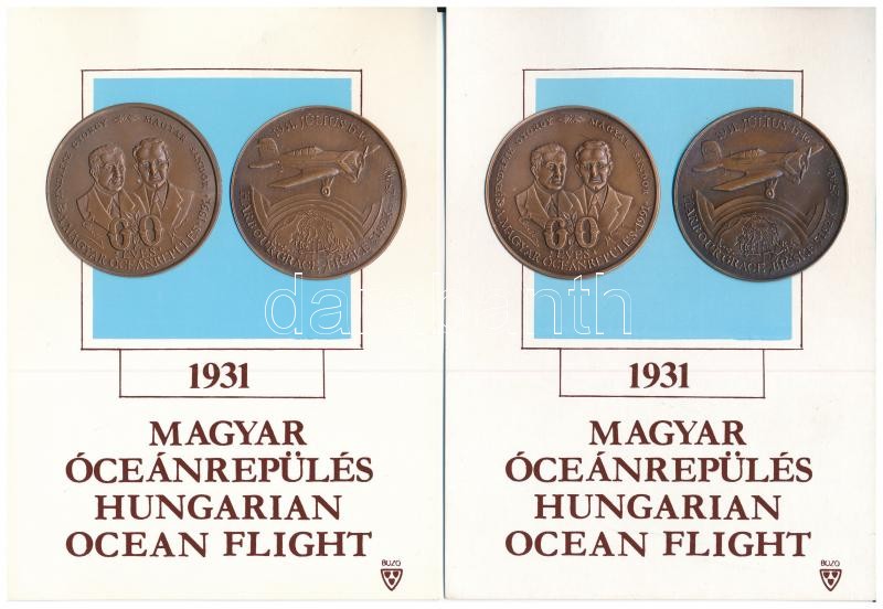 Description: Bozó Gyula (1913-2004) 1991. "60 éves a magyar óceánrepülés Endresz György - Magyar Sándor / Harbour Grace - Bicske" emlékérem bronz lemezérem változata díszlapon (2x)