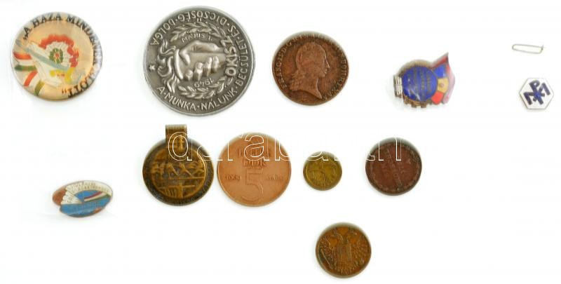 Description: 11db-os vegyes magyar és külföldi fémpénz, zseton, jelvény tétel, közte Ausztria 1782A 1Gr + "A munka nálunk becsület és dicsőség dolga - 1949. május 1.) Al jelvény hátlapon"LUDVIG BP" gyártói jelzéssel (43mm) T:vegyes