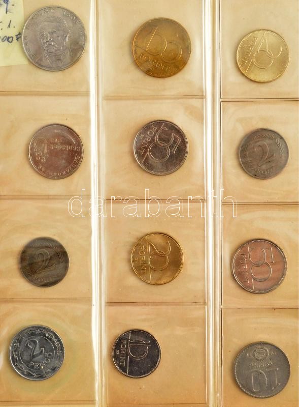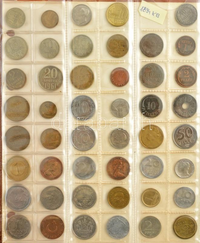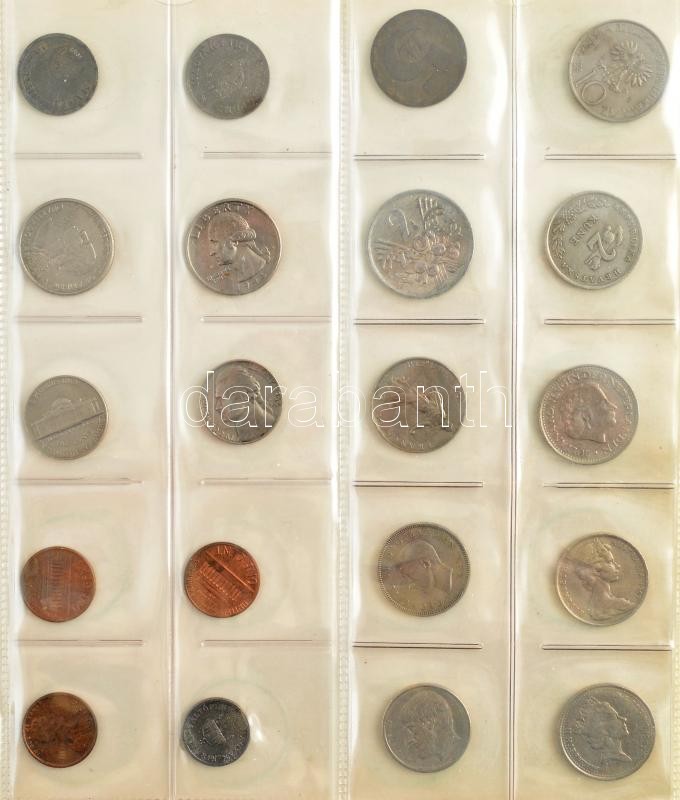 144db-os vegyes magyar és külföldi érmetétel használt de jó állapotú berakóba rendezve, összesen 7db berakólapon, közte 1994. 200Ft Ag "Deák" + 1920KB 20f Fe (4x) + 1966. 50f Al + Marokkó 1921. 1Fr Ni + Lesotho, Fülöp-szigetek, Amerikai Egyesült Államok, Ausztrália T:vegyes 144pcs mixed Hungarian and foreign coin lot in a holder (used but good condition) with 7 sheets, within Hungary 1994. 200 Forint Ag "Deák" + 1920KB 20 Fillér Fe (4x) + 1966. 50 Fillér Al + Morocco 1921. 1 Franc Ni + Lesotho, Philippines, USA, Australia C:mixed