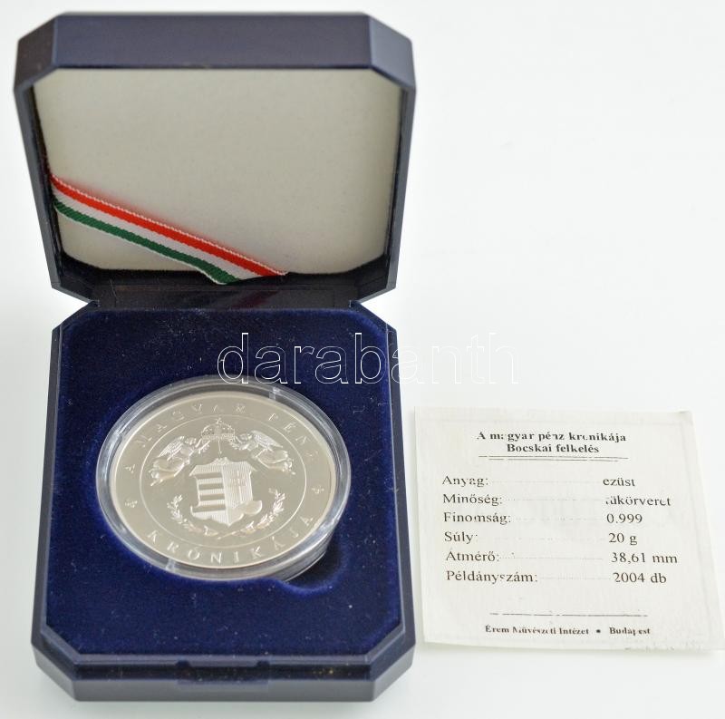 https://www.darabanth.com/en/412-Online-auction/412.0/Numismatics/Modern-restrikes-fantasy-coins~1500022/DN-A-magyar-penz-kronikaja-Bocskai-felkeles-Ag-emlekerem-tanusitvannyal-20g099938-6~II2563781