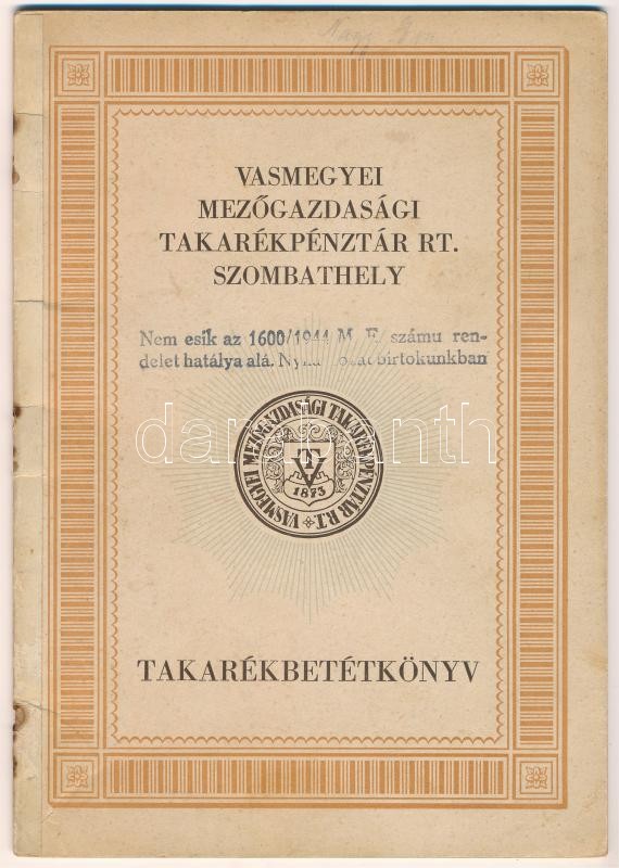 1944. "Vasmegyei Mezőgazdasági Takarékpénztár Rt. Szombathely&quo... https://www.darabanth.com/en/412-Online-auction/412.0/Numismatics/Numismatics-documents-and-letters~1500004/1944-Vasmegyei-Mezogazdasagi-Takarekpenztar-Rt-Szombathely-takarekbetetkonyve-elolapon~II2564471