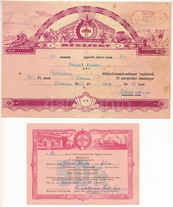 https://www.darabanth.com/en/412-Online-auction/412.0/Numismatics/Shares-and-Tickets~1500006/1951-SZOVOSZ-50-Ft-takarekszovetkezeti-reszjegy-befizeteserol-szolo-igazolas-plus-1956-SZ~II2573059