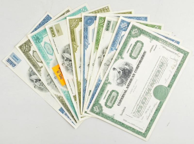 Description: Amerikai Egyesült Államok 1968-1980. 10xklf részvény felülbélyegzésekkel, lyukasztásokkal érvénytelenítve T:II-III néhányon tűlyuk