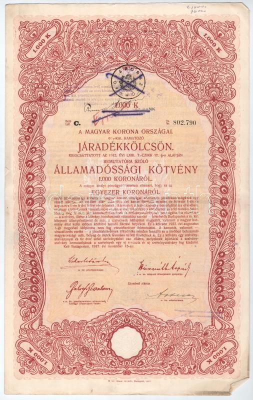 Budapest 1917. "A magyar korona országai 6%-kal kamatozó Járadékk... https://www.darabanth.com/en/412-Online-auction/412.0/Numismatics/Shares-and-Tickets~1500006/Budapest-1917-A-magyar-korona-orszagai-6-kal-kamatozo-Jaradekkolcson-allamadossagi-kot~II2563987