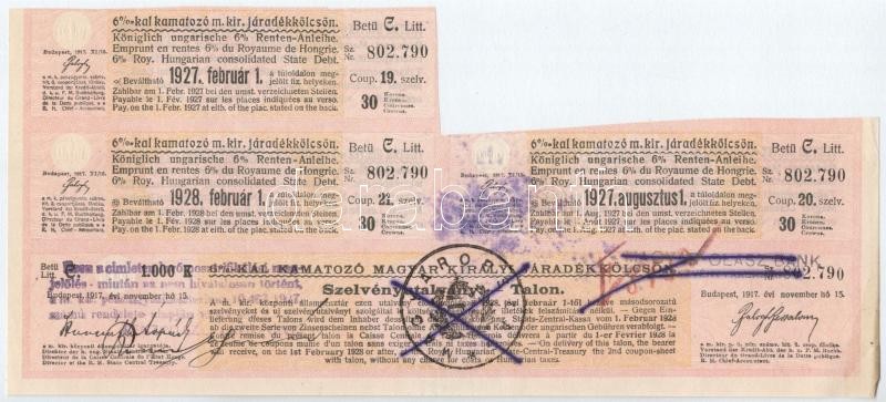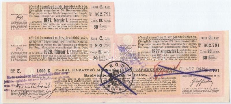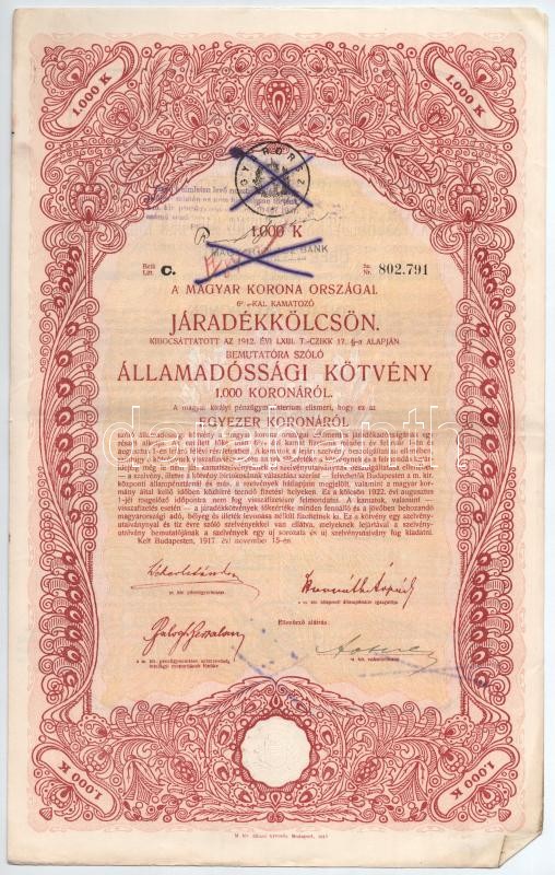 Description: Budapest 1917. "A magyar korona országai 6%-kal kamatozó Járadékkölcsön" államadóssági kötvénye 1000K-ról, szelvényekkel, bélyegzéssel és szárazpecséttel (2x) áthúzással érvénytelenítve T:III az egyik lap szélén apró szakadás