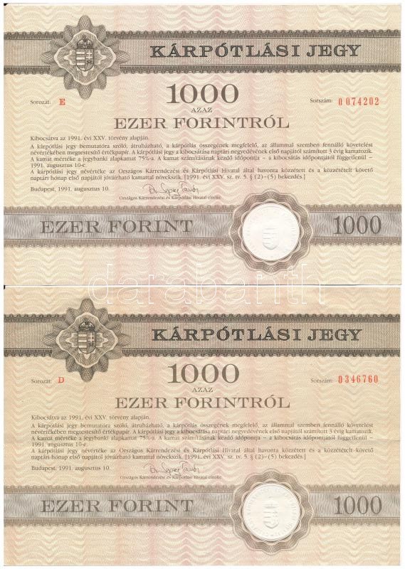 Budapest 1991. "Országos Kárrendezési és Kárpótlási Hivatal" kárpótlási jegye 1000Ft-ról (2x) "D + E" sorozat, szárazpecséttel T:II-III