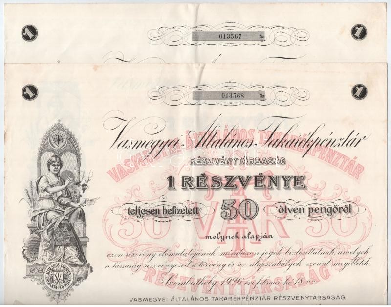 Description: Szombathely 1926. "Vas Megyei Általános Takarékpénztár" névre szóló részvény 50P-ról (2x) sorszámkövetők, szelvényekkel, szárazpecséttel, a lapok alján egy nagyobb szakadás T:III