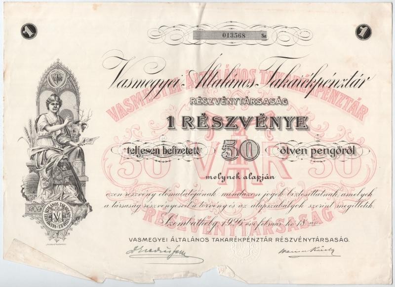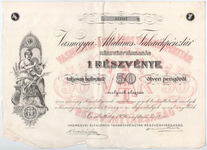 Szombathely 1926. "Vas Megyei Általános Takarékpénztár" névr... https://www.darabanth.com/en/412-Online-auction/412.0/Numismatics/Shares-and-Tickets~1500006/Szombathely-1926-Vas-Megyei-Altalanos-Takarekpenztar-nevre-szolo-reszveny-50P-rol-2x~II2563890