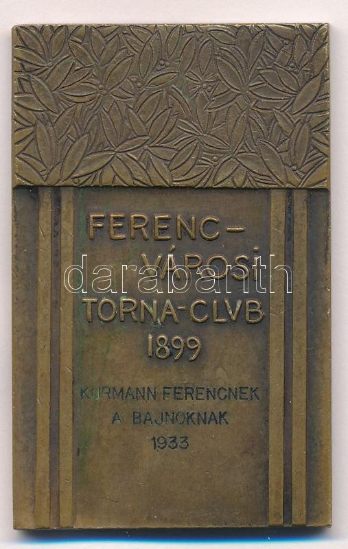 Berán Lajos (1883-1943) 1933. "Ferencvárosi Torna-Club 1899" kétoldalas bronz díjplakett, hátoldalon gravírozva "KURMANN FERENCNEK A BAJNOKNAK 1933" (38x59mm) T:2