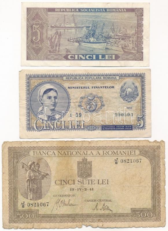 Románia 1941. 500L + 1952. 5L + 1966. 5L T:III, III- az egyiken szakad... https://www.darabanth.com/en/412-Online-auction/412.0/Numismatics/Worldwide-banknotes~1500013/Romania-1941-500L-plus-1952-5L-plus-1966-5L-TIII-III-az-egyiken-szakadasok-anyaghiany-Romania-1~II2572821