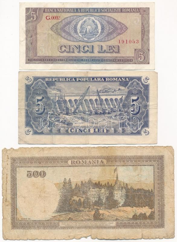 Description: Románia 1941. 500L + 1952. 5L + 1966. 5L T:III, III- az egyiken szakadások, anyaghiány