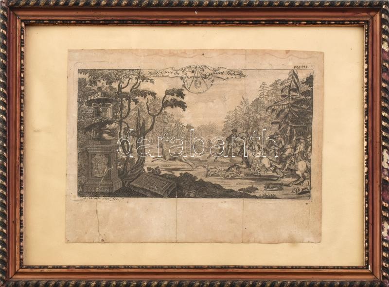 Description: Christian Albert Wortmann (1680-1760): Szent Hubertusz kürtje. Rézmetszet, papír. Jelzett a metszeten. Sérült. Foltos. Üvegezett, sérült fa keretben. 12x20 cm