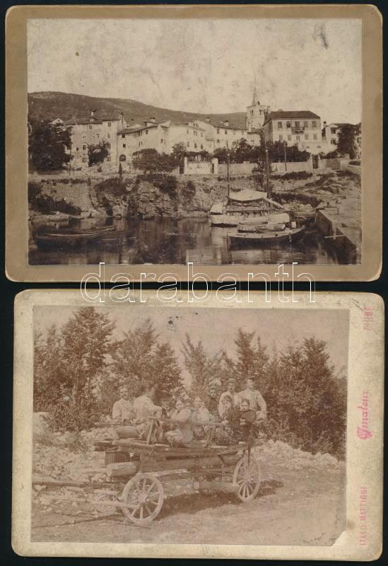 1893 Lovran (Horvátország), városrészlet, kirándulás kocsin, 2 db keményhátú fotó kopásnyomokkal, 13×18 cm