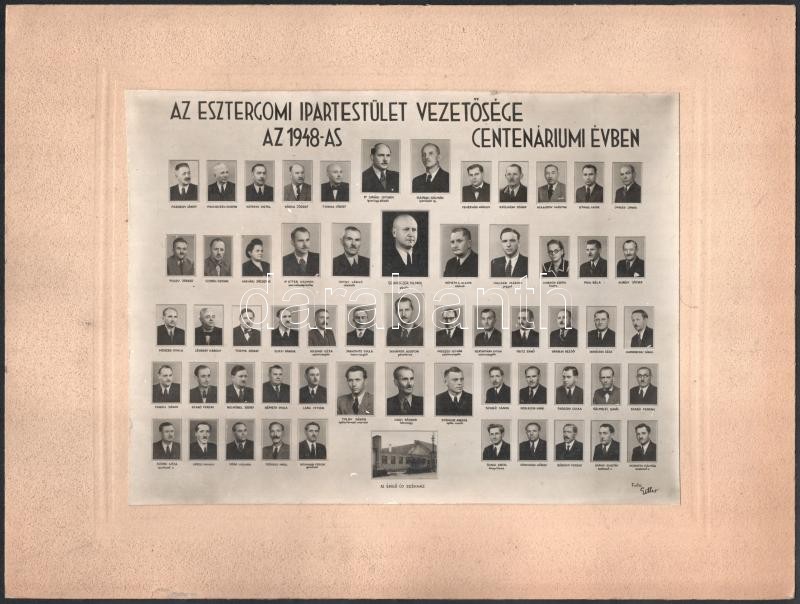 Description: 1948 Az Esztergomi Ipartestület vezetősége az 1948-as centenáriumi évben, tablókép az épülő új székház fotójával, jó állapotban, kartonra kasírozva, 17,5×22,5 cm