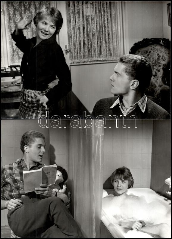1960 Törőcsik Mari (1935-2021) a Nemzet Színésze a ,,Két emelet boldogság" című film három jelenetében, 3 db vintage produkciós filmfotó, 20x29 cm