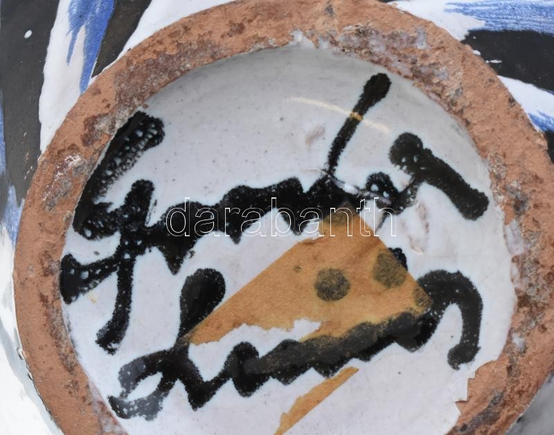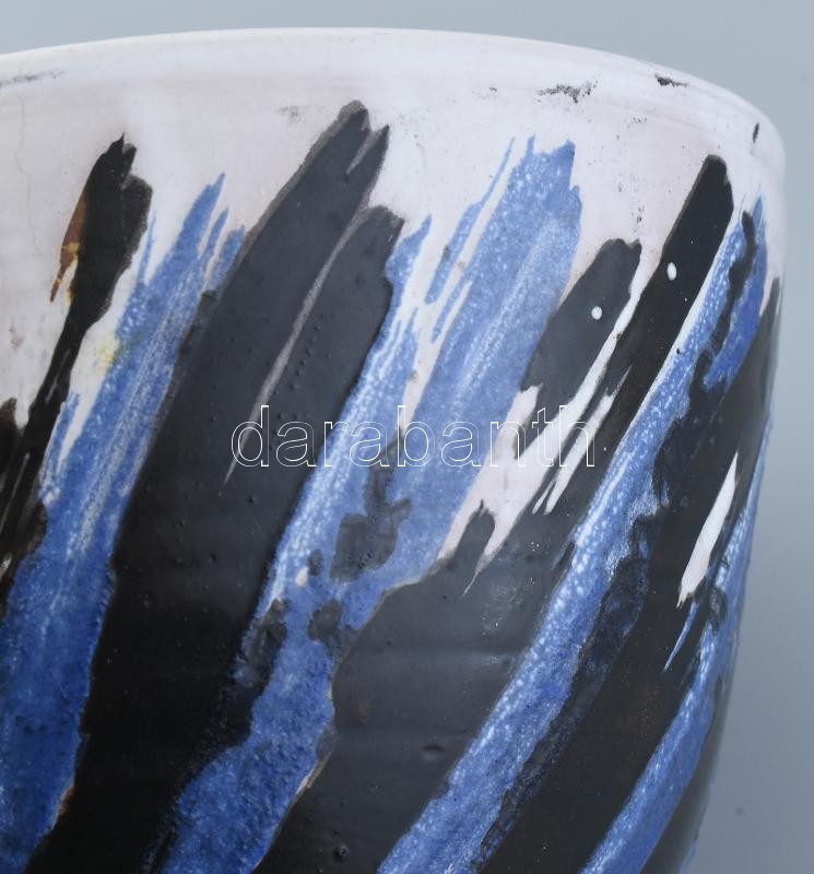 Gorka Lívia (1925 - 2011) Díszkaspó. Korongozott és kézzel formázott kerámia. Oldalán csavart mintázatú, többrétegű, színes mázakkal festett és visszakarcolt technikával díszített test. Vízkőmaradványok. Alján jelzett: festett Gorka Lívia. m: 14cm, d: 19cm