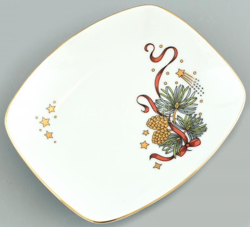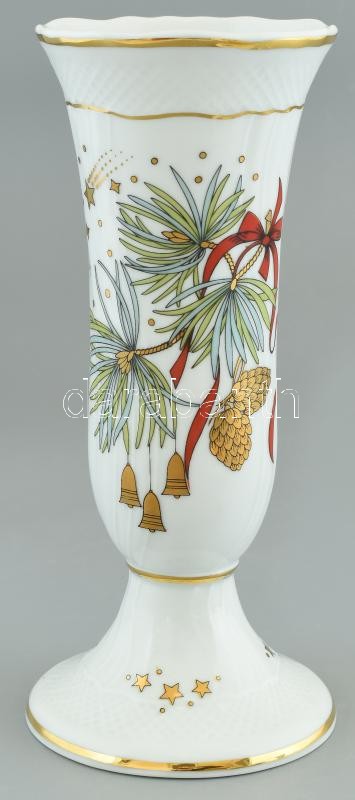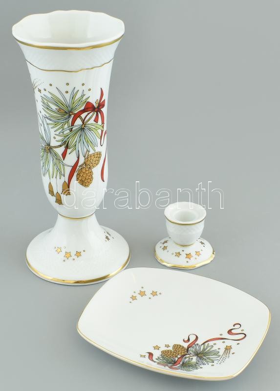 Hollóházi Karácsony mintás váza m:22cm, tálka 14x12cm, gyertyatartó m:4,5cm. Matricás porcelán, jelzett, kopásnyomokkal, gyári kartondobozban.