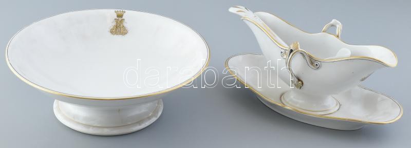 Kínálótál, szoszié, porcelán, jelzett, nemesi korona és monogram: HM?, kopott, d: 25,5cm, 26x12,5cm