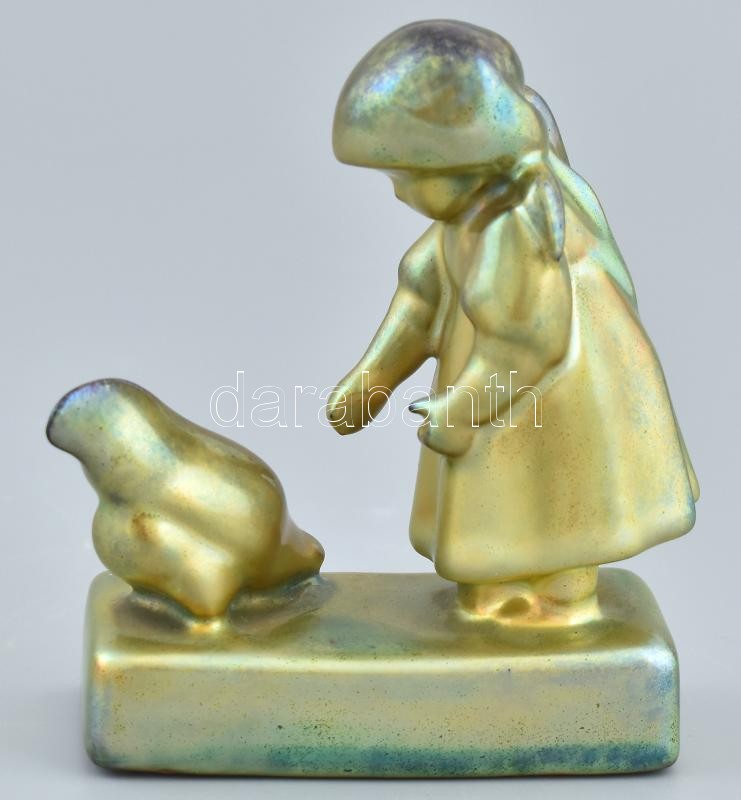 Zsolnay eozin mázas kislány tyúkkal, jelzett, kopásnyomokkal, mázreped...