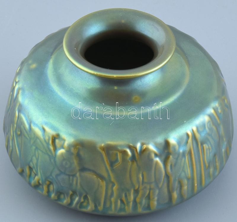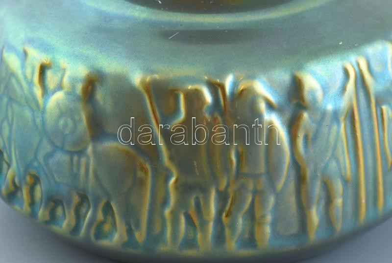Zsolnay eozin mázas váza (harcosok). Jelzett, hibátlan. d: 13 cm, m: 8...