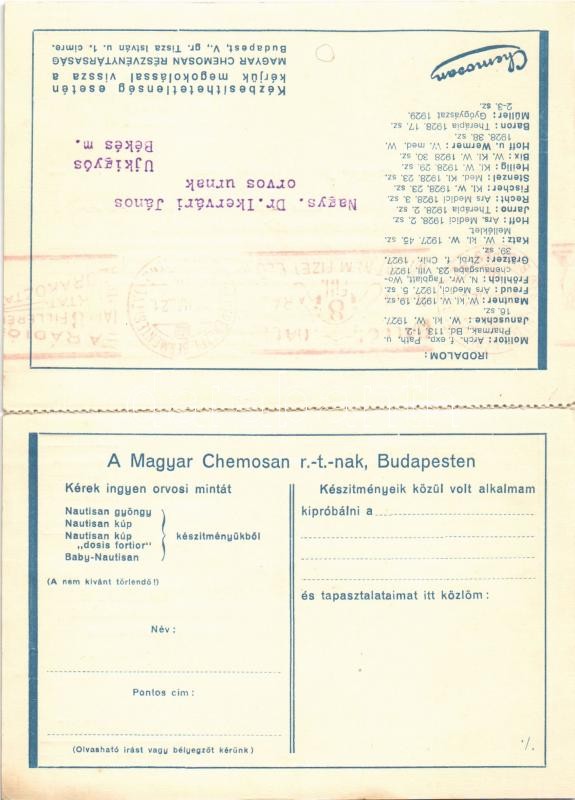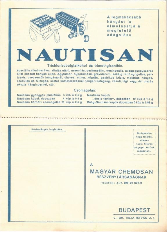 Description: "A legmakacsabb hányást is elmulasztja a megfelelő adagolású Nautisan" Magyar Chemosan Részvénytársaság Budapest V. Gróf Tisza István utca 1. Kihajtható reklámlap / Hungarian medicine advertisement card. folding card