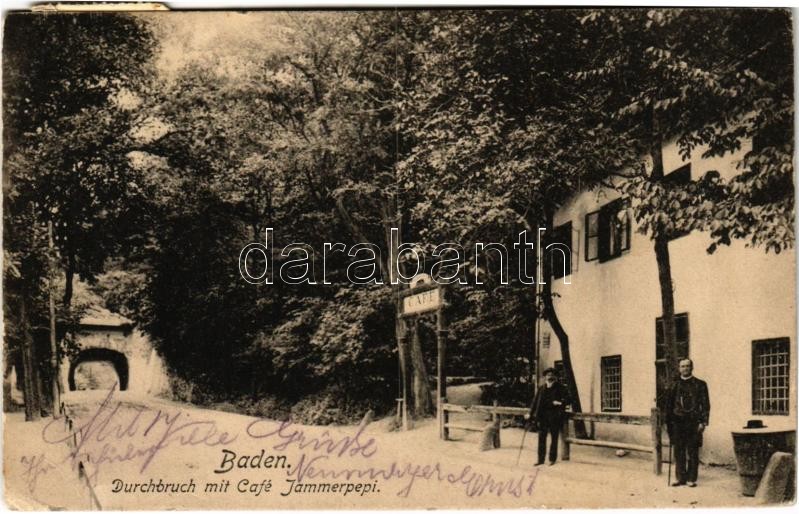 1908 Baden bei Wien (Baden), Durchbruch mit Café Jammerpepi / street view, café (EK)