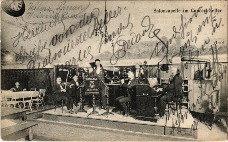 1911 Wien, Vienna, Bécs; Jos. Parzer's Restaurant "Bürgertheater" Hauptstraße 1a. Saloncapelle im Concert-Keller / restaurant, interior with music band. "Anitta" Wien (EK)