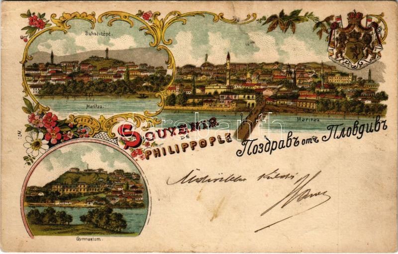 1899 (Vorläufer) Plovdiv, Philippople, Philippopolis; Sahat-tépé, Maritza, Gymnasium / general view, grammar school, coat of arms. Art Nouveau, floral, litho (r)