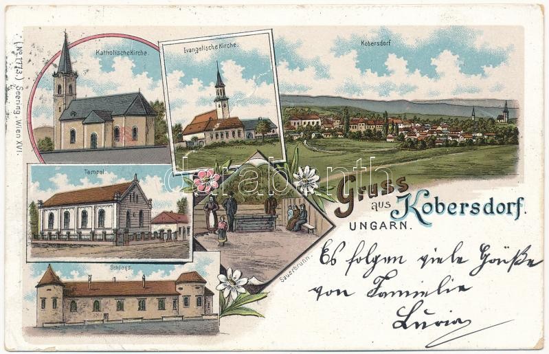 1905 Kabold, Kobersdorf; Katholische und Evangelische Kirche, Schloss, Sauerbrunn, Isr. Tempel / templomok, zsinagóga, savanyúvíz forrás, kastély / churches, mineral water spring, castle, synagogue. Art Nouveau, floral, litho (gyűrődés / crease)