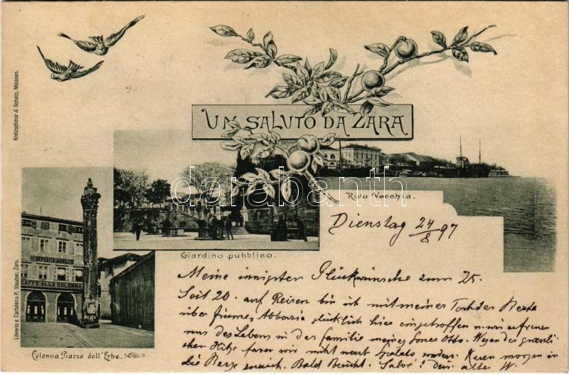 1897 (Vorläufer) Zadar, Zara; Riva Vecchia, Giardino pubblico, Colonna Piazza dell'Erbe, Deposito Mobili, Caffe alla Colonna / old port, park, monument, cafe shop