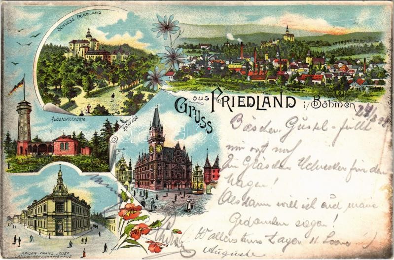 Description: 1898 (Vorläufer) Frydlant, Friedland (i. Böhmen); Schloss Friedland, Ausschtsturm, Rathaus, Kaiser Franz Josef Landwirtschaftshaus / castle, lookout tower, town hall. Art Nouveau, floral, litho (vágott / cut)