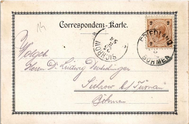 1898 (Vorläufer) Frydlant, Friedland (i. Böhmen); Schloss Friedland, A... https://www.darabanth.com/en/412-Online-auction/412.0/Postcards/Czech-Republic~2000029/1898-Vorlaufer-Frydlant-Friedland-i-Bohmen-Schloss-Friedland-Ausschtsturm-Rathaus-Kaiser~II2568933