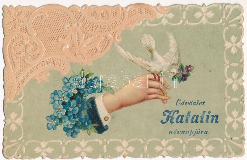Üdvözlet Katalin névnapjára. Csipke hatású dombornyomott virágos litho üdvözlőlap / Name day. Lace style ermbossed litho greeting art postcard