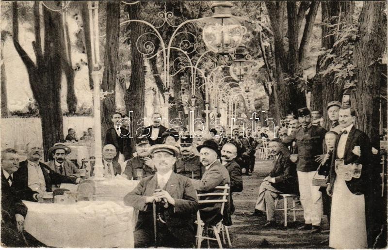1916 Budapest XV. Rákospalota-Újpest, Horváth Imre nagyvendéglője, kert katonákkal, vendégekkel és pincérekkel