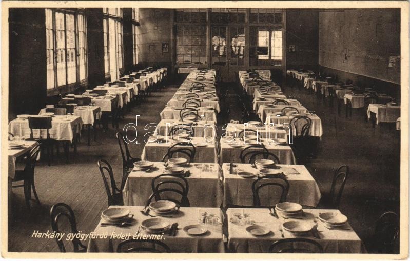 1939 Harkány, Gyógyfürdő fedett éttermei, belső, hátoldalon reklám