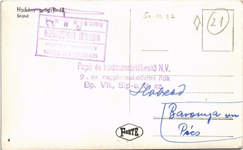 Harkány-gyógyfürdő, strand. Hátoldalon Népművelési Minisztérium Képzőművészeti osztálya nyomását engedélyezem 1950.