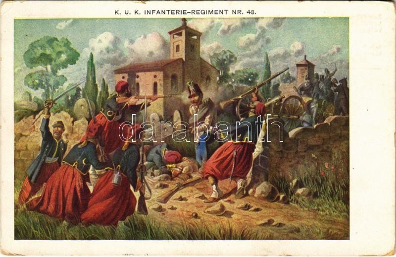 Description: 1913 Schuh János ezredünk szakaszvezetője a Solferinói csatában 1859. június 24-én vakmerő támadásával megment egy ágyút / K.u.K. Infanterie-Regiment Nr. 48. / Austro-Hungarian K.u.K. military art postcard, Battle of Solferino (kopott sarkak / worn corners)