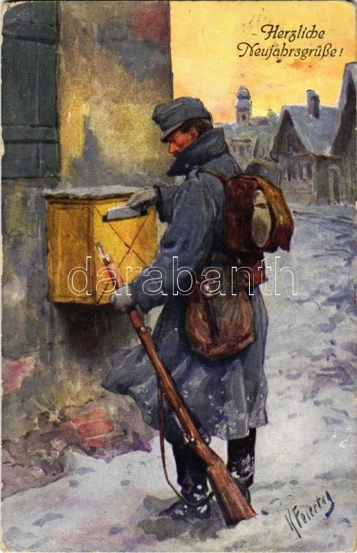 1915 Herzliche Neujahrsgrüße! / WWI Austro-Hungarian K.u.K. military art postcard with New Year greeting. B.K.W.I. 3162-5. s: K. Feiertag (EK)