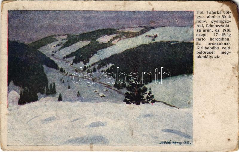 Dol. Tatárka völgye, ahol a 30. honvéd gyalogezred, felmorzsolása árán, az 1916. szept. 17-26-ig tartó harcaiban, az oroszoknak Kirlibabába való betörését megakadályozta. A m. kir. 30. honvéd gyalogezred özvegy- és árvaalapja javára kiadja a 30. honvéd pótzászlóalj ezredtört. csoportja / WWI Austro-Hungarian K.u.K. military art postcard s: Juszkó (b)